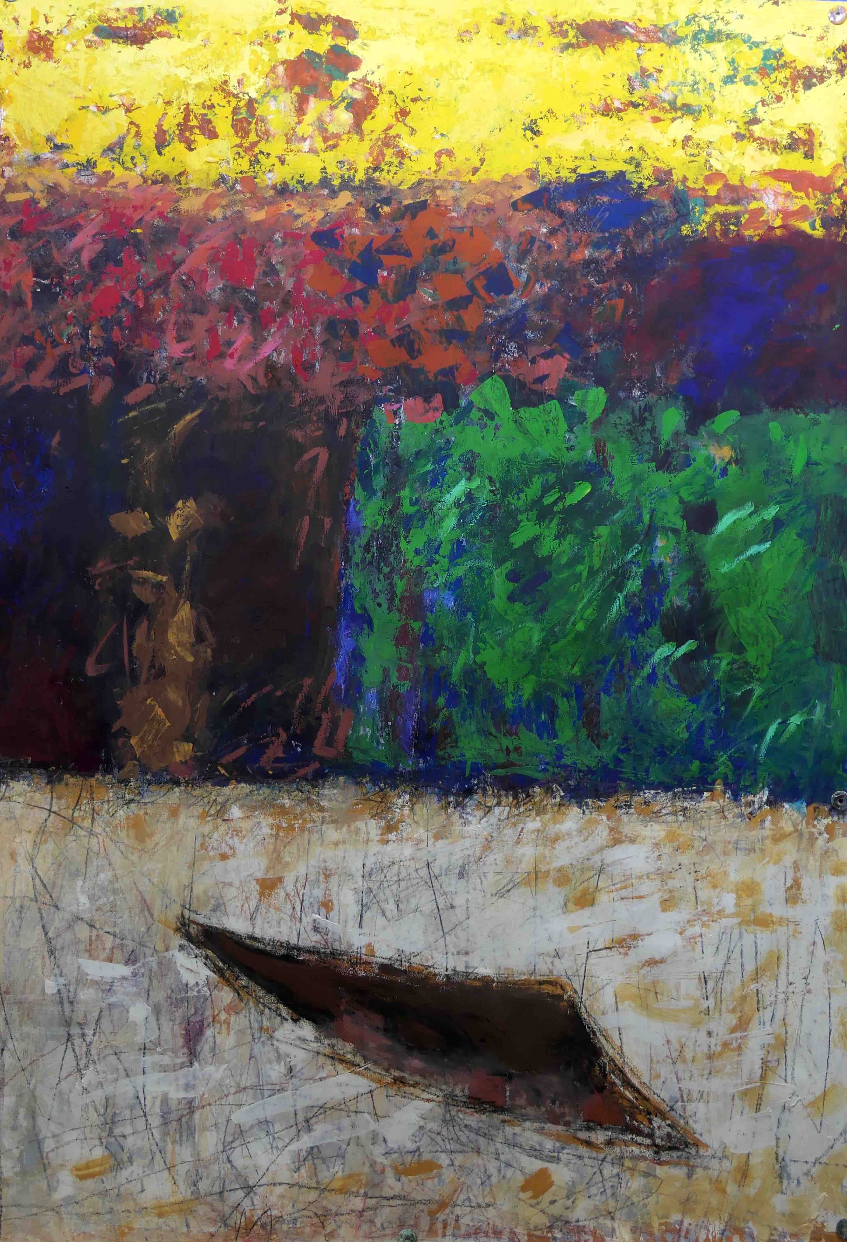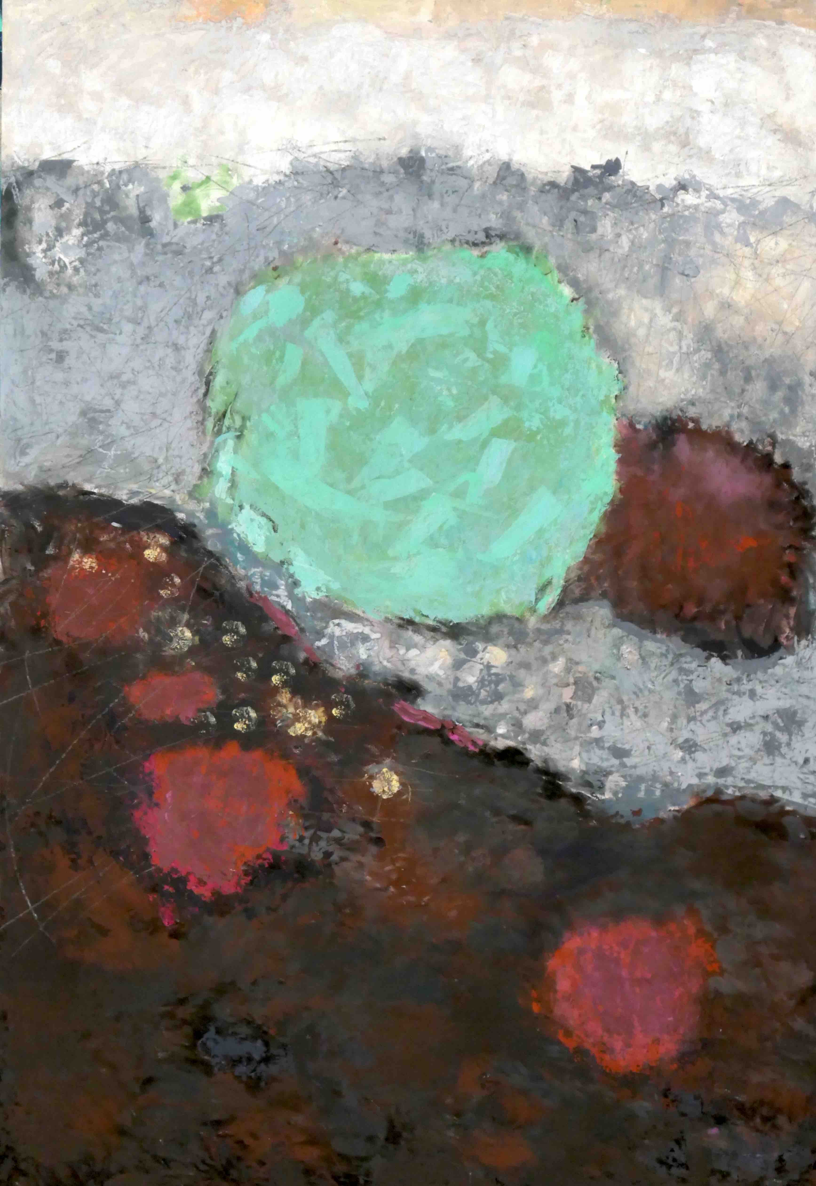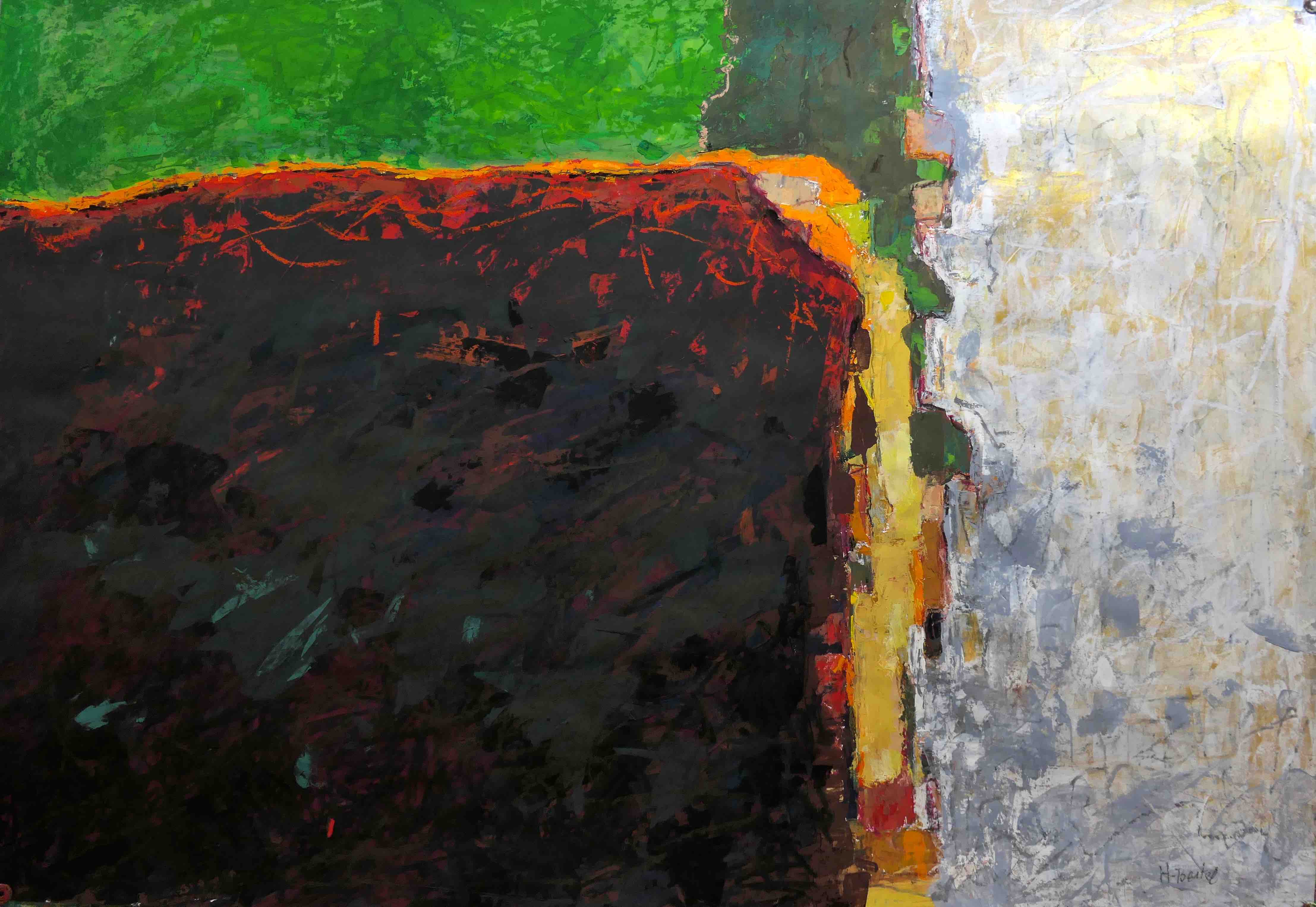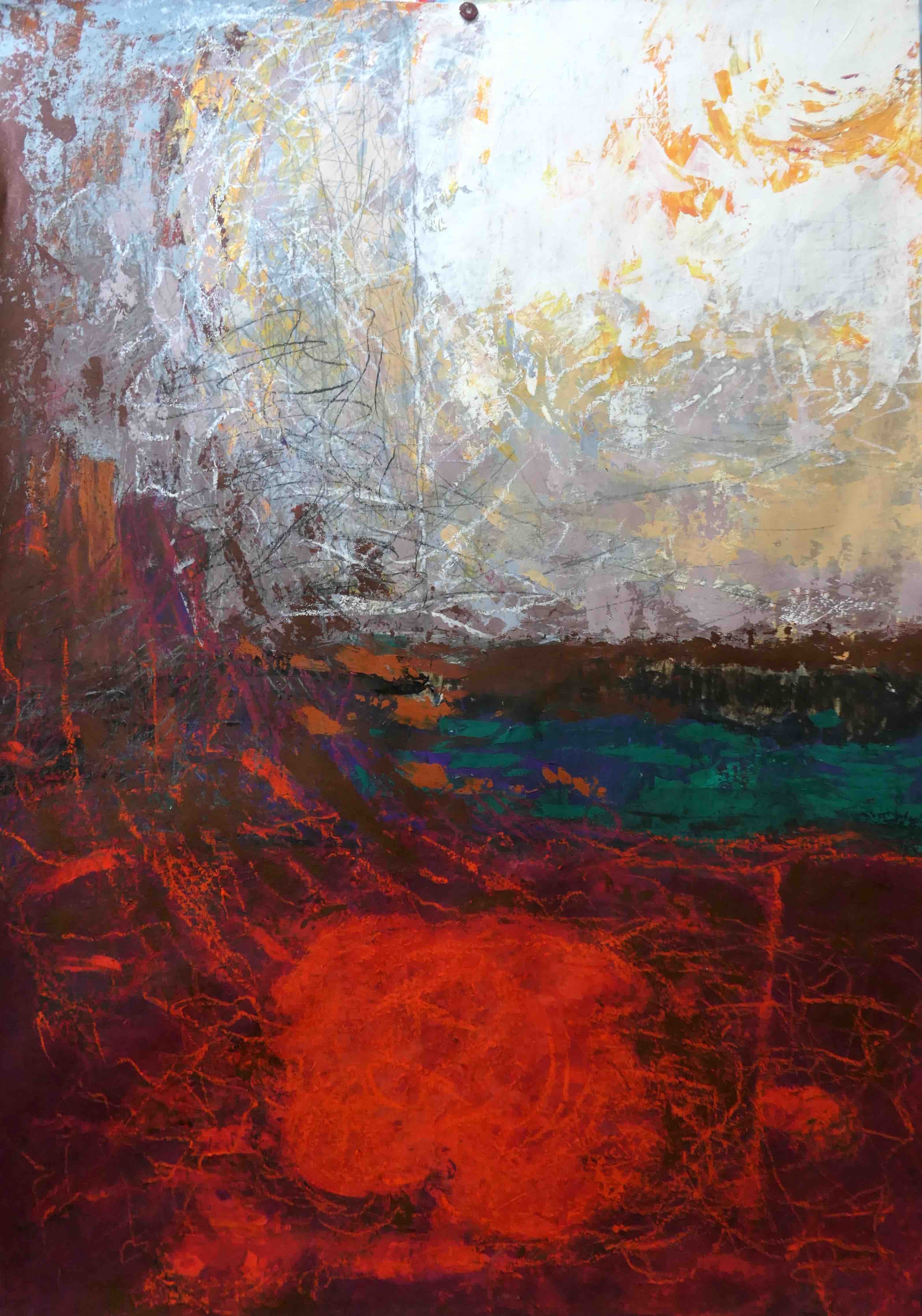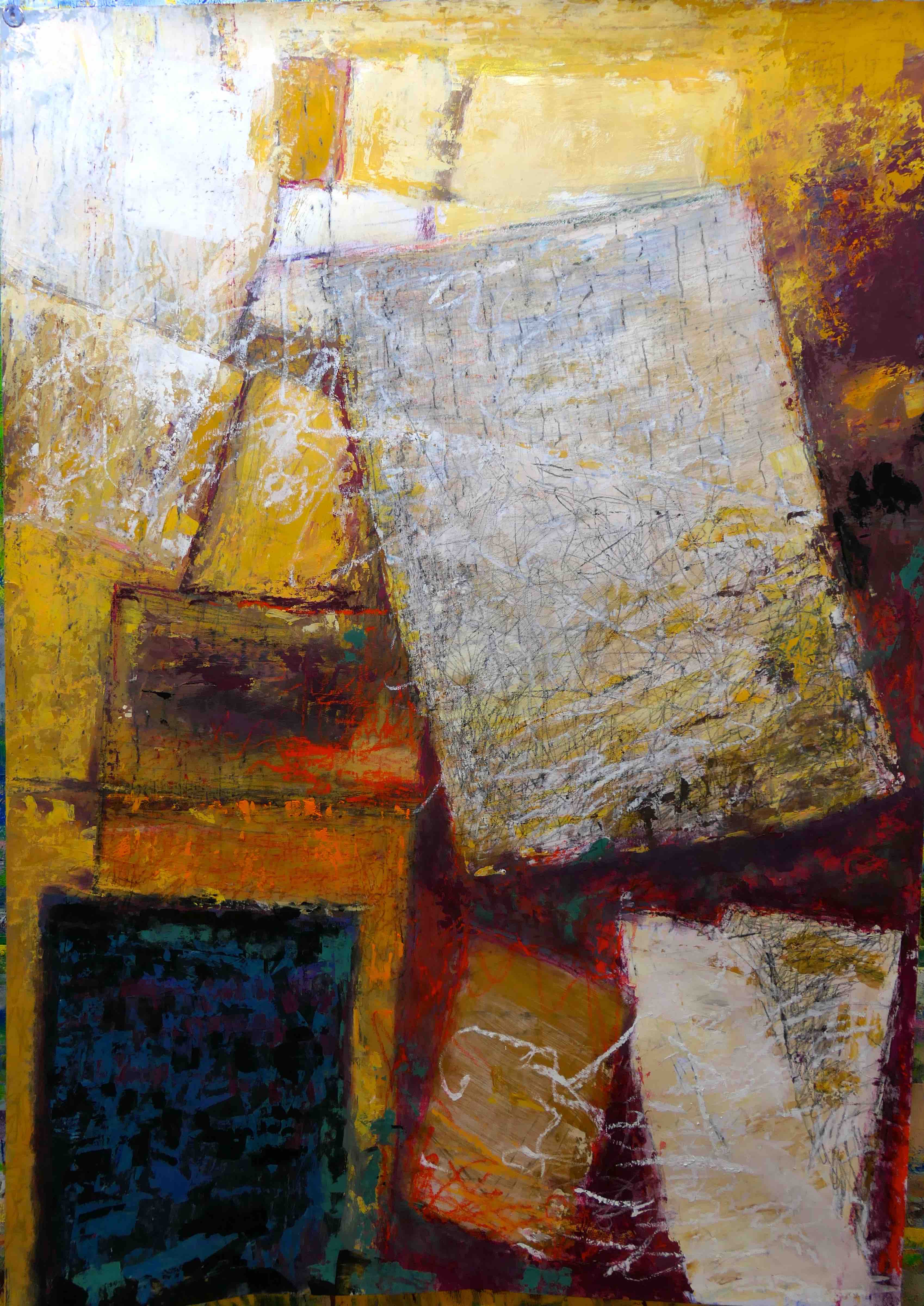 Abstraktion – Flächen, auf denen sich intuitives Empfinden entfalten kann. Bilder verlieren den konkreten Gegenstand, um an eine Grenze zu kommen, hinter der erst die Worte für eine Aussage gefunden werden müssen. Sie sind dann „fertig“ (wann ist ein Bild schon fertig), wenn sie eine Seele haben, die der Benennung voraus ist.