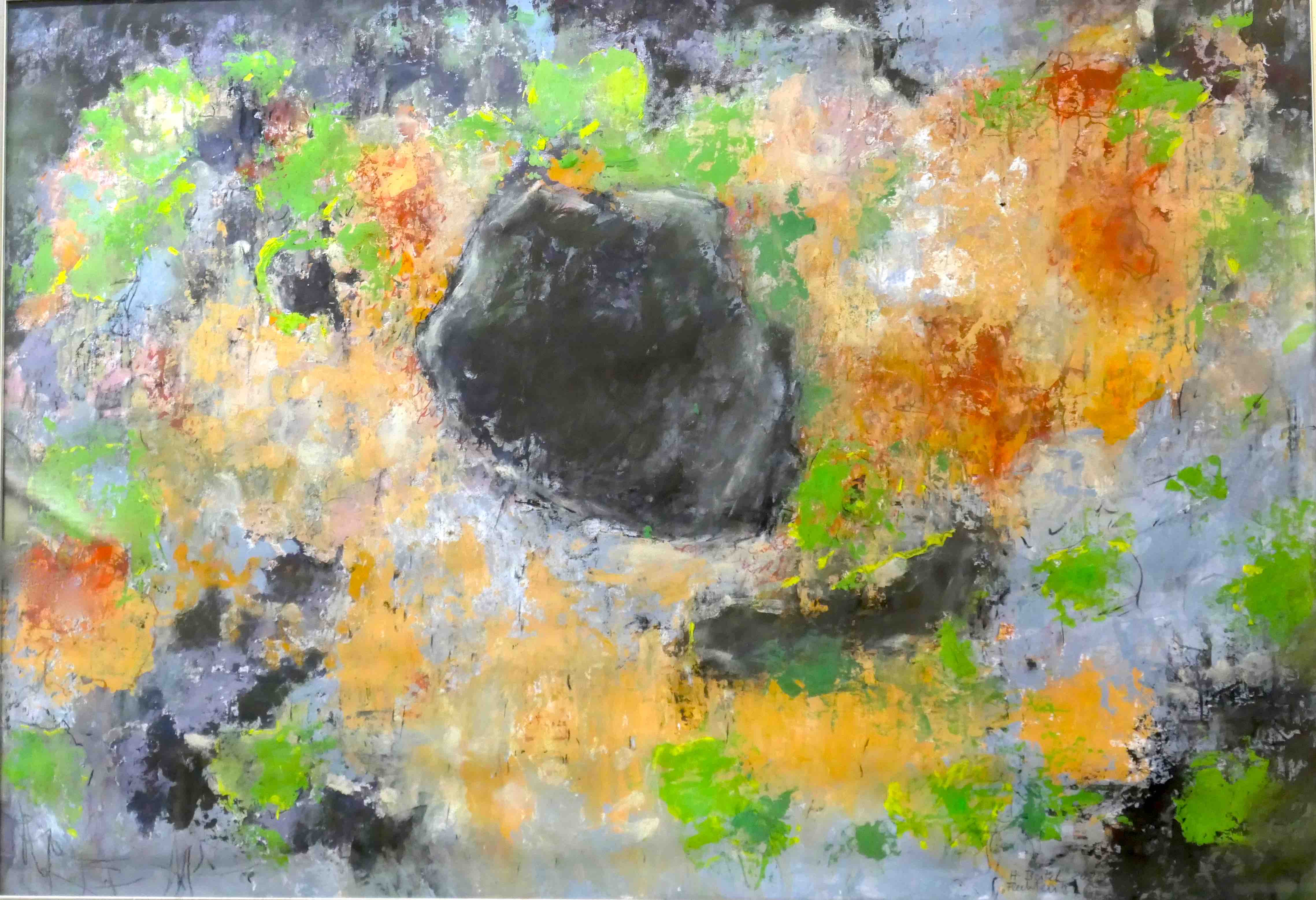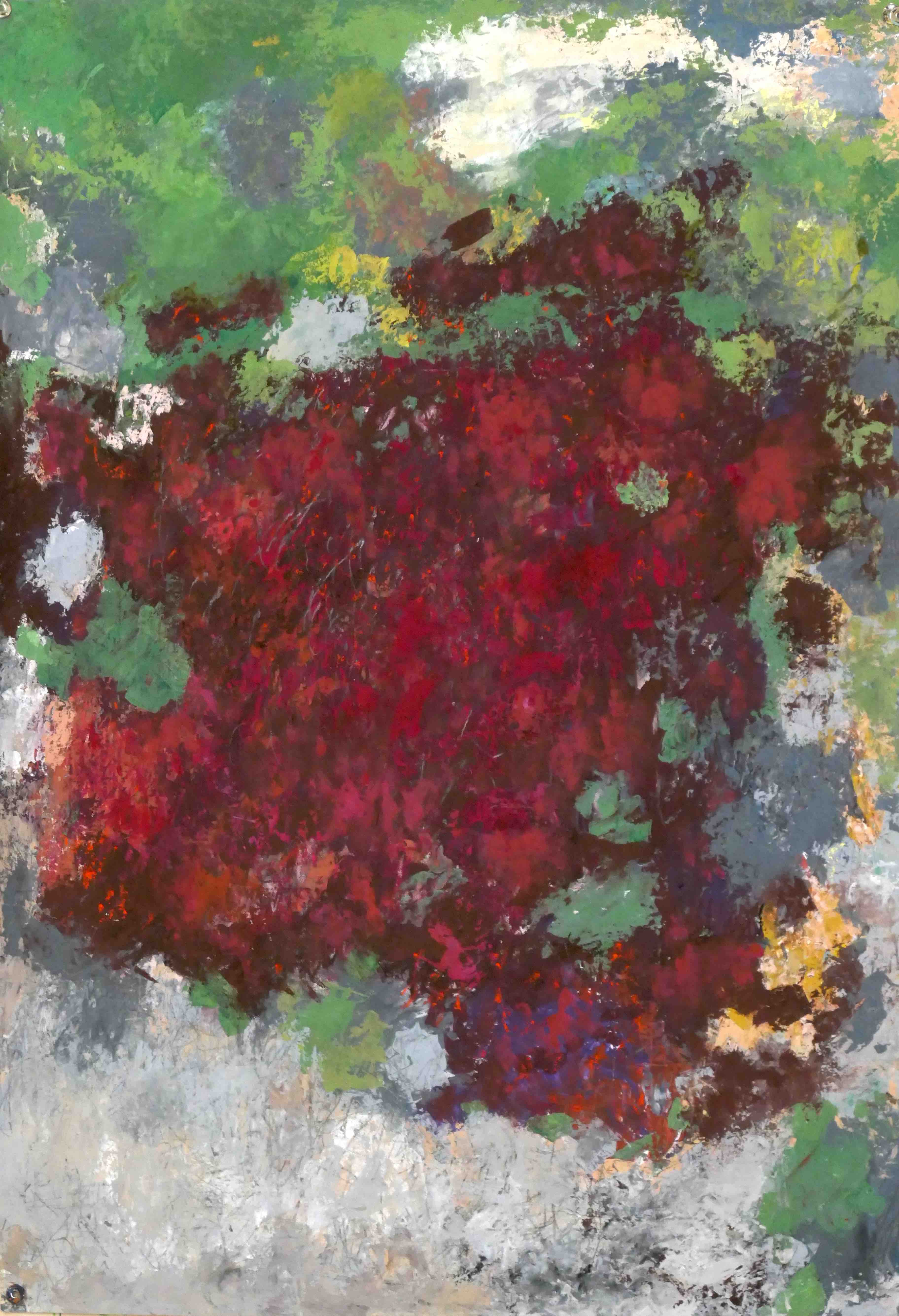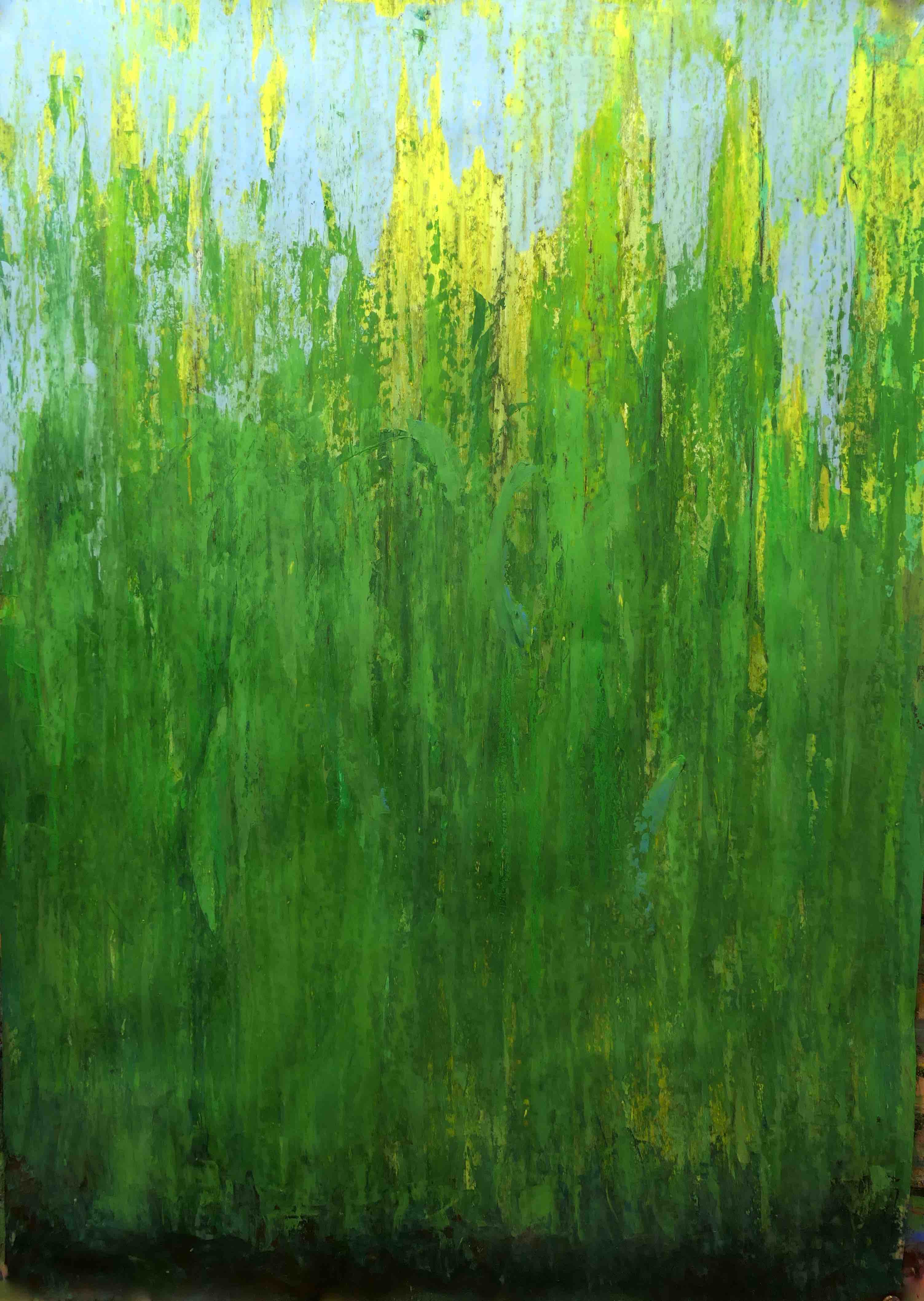 Sie sind „hintergründige“ Bilder, etwa „Grün“ als vom Wesen her gesagt, das aber letztlich nicht definiert werden kann. Farbe primär. Aber auch Struktur, Dynamik, Energie, Lineares und Flächiges sind spontan eingesetzte Ausdrucksmittel.